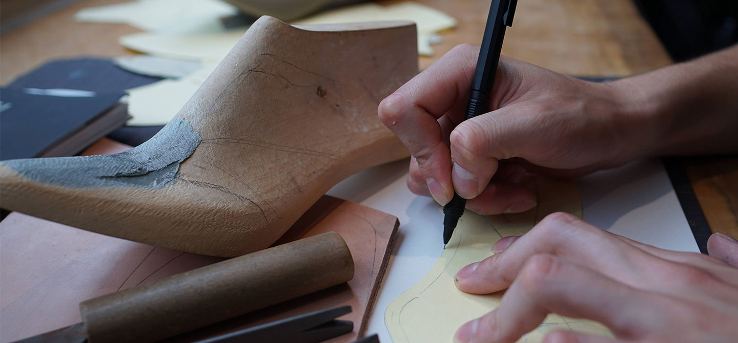 靴のデザインから型紙までオレンズ0.2mmを使用しています。パターン用紙に木型から写し取った型紙(原型)を基準に各パーツを型紙に作り出します。これは1度だけでなく仮アッパーで確認して2、3度修正を入れながら繰り返してパターンの精度を上げていかなければならないです。その際に、従来のペンの太さ分だとペンの内側と外側のずれで誤差が生じることがあります。オレンズ0.2mmだと線も細く線の上をカットしていくと何度も繰り返し写し取っても誤差もなく精度が高いパターンができるのでオレンズ0.2mmを愛用しています。