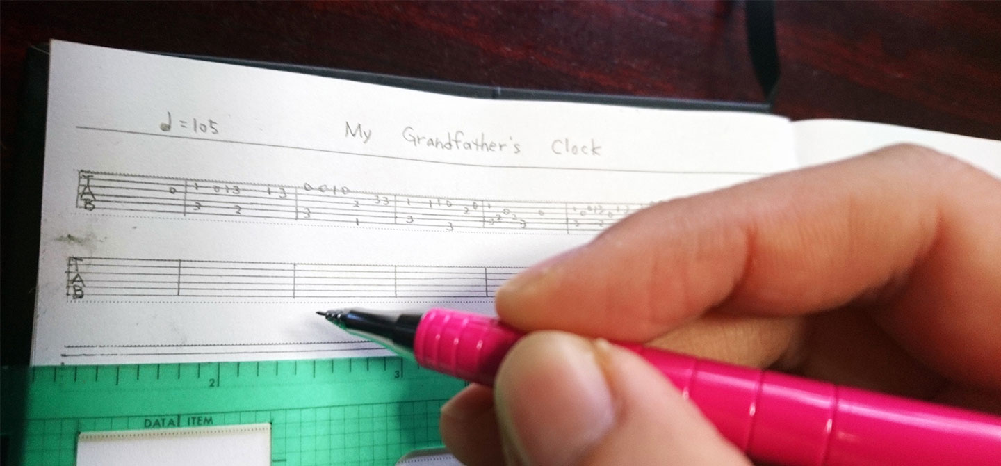 ノートの罫線内にギターのタブ譜を書きたくて使っています。0.5mmだと線や字が潰れてしまってきれいに書けないけれど、オレンズ0.2mmを使えば細かく書いてもはっきり見えます。小さく書くことで1曲を1つのページに収めることができて、練習中にページをめくる煩わしさも解消されました。
